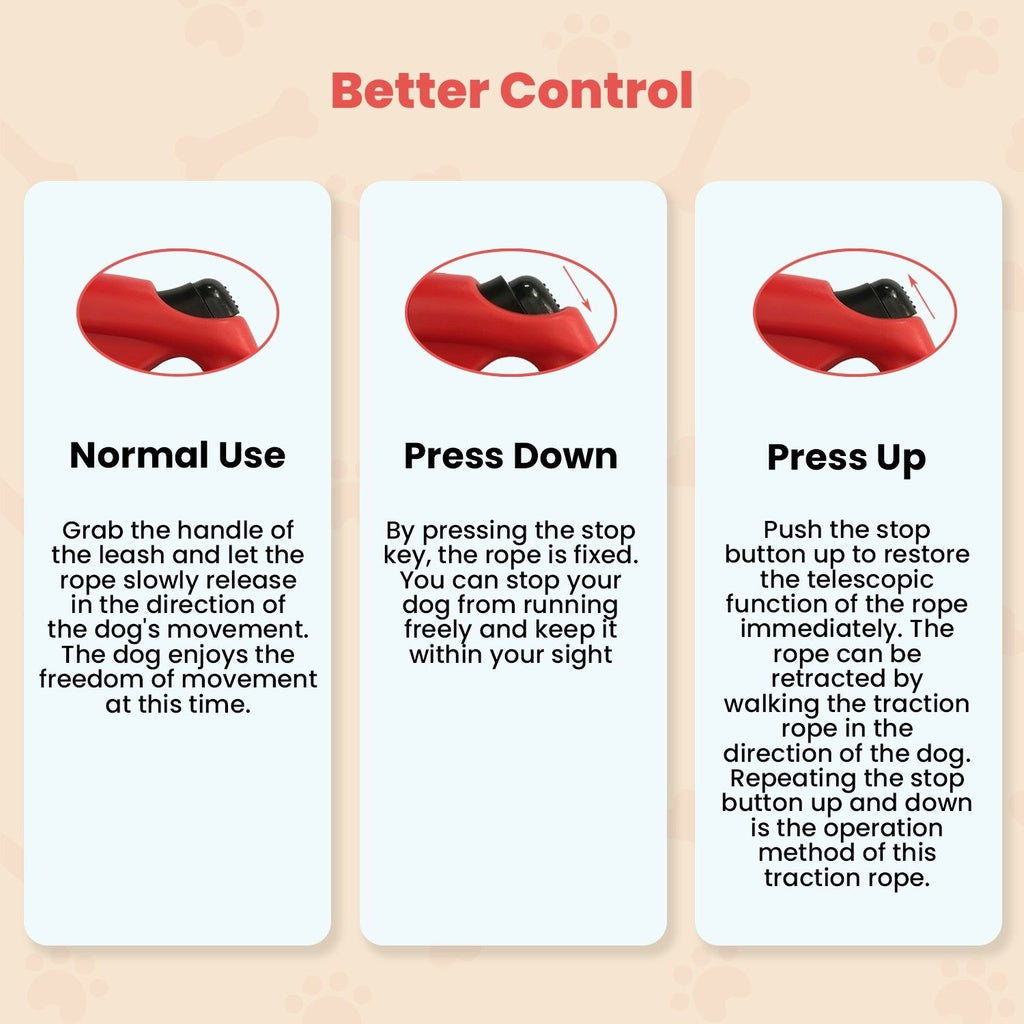 - Better Control: Manage the distance with just a push of a button. Extend the leash up to 15 feet to allow more freedom for your pet or retract it to keep your fur buddy close by your side.